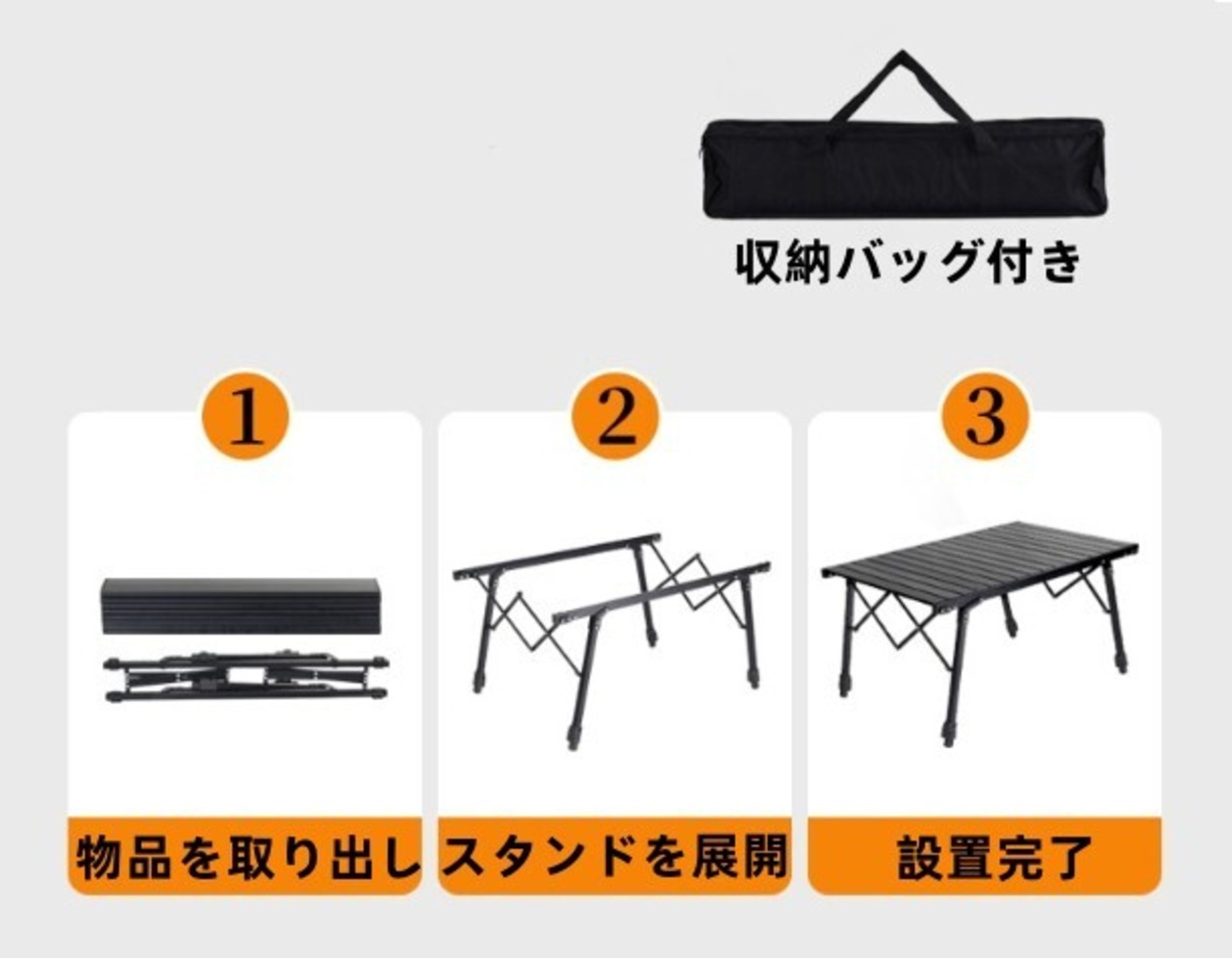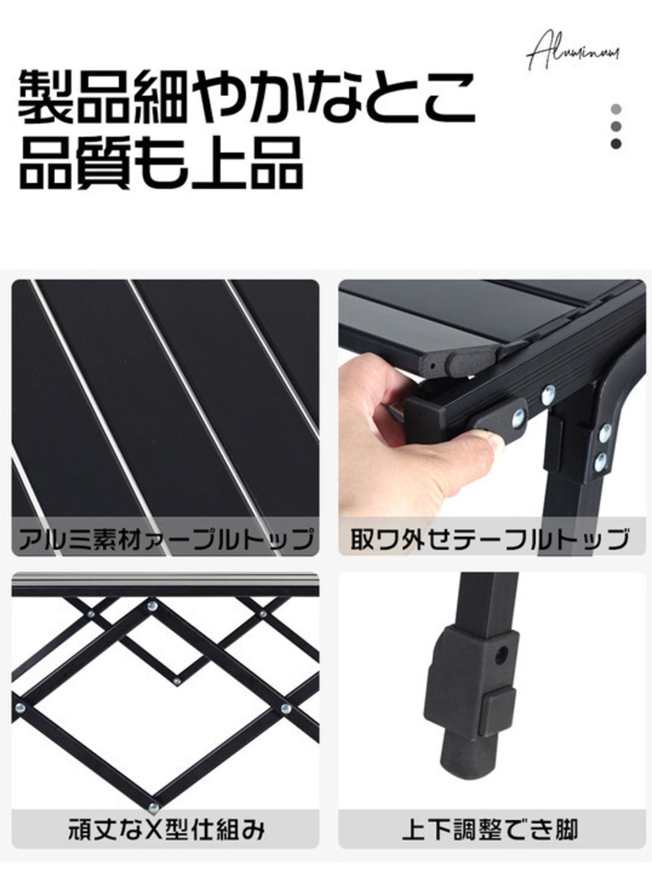 このテーブルは、頑丈なアルミ素材で作られているため、安定感があります。キャンプやピクニック、バーベキューなどのアウトドアイベントで活躍してくれること間違いなし。また、持ち運びに便利な折りたたみ式で、コンパクトに収納できます。