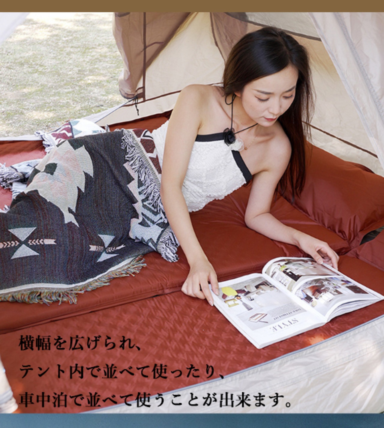 ・横幅を広げられ、テント内で並べて使ったり、車中泊で並べて使うことが出来ます。